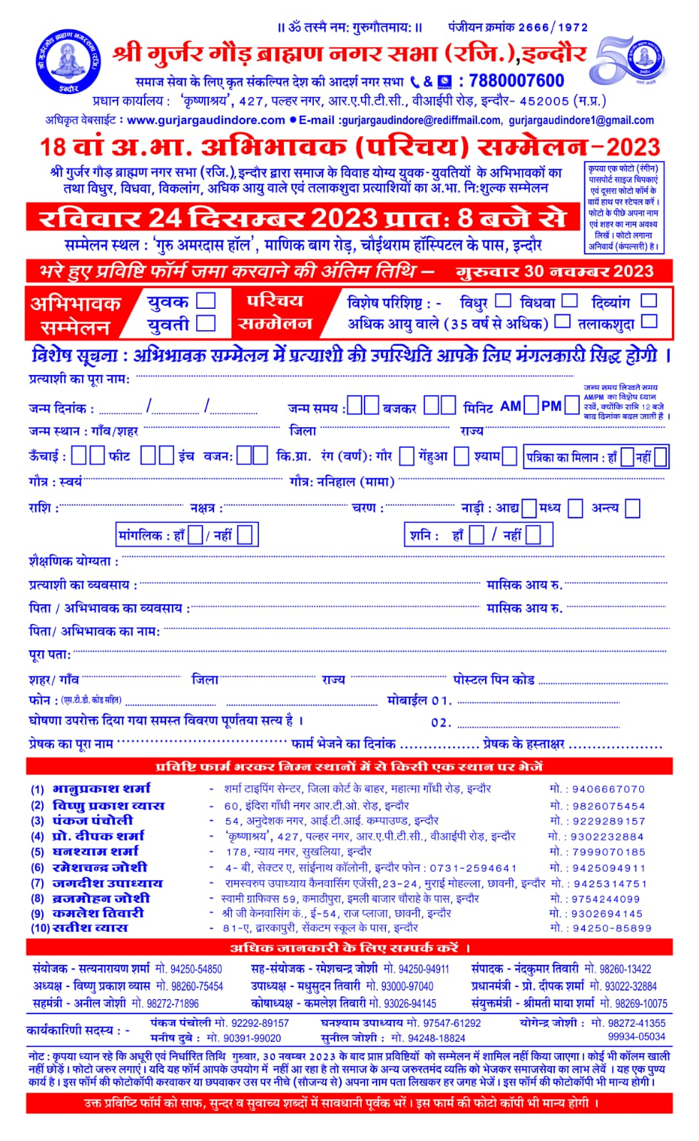 श्री गुर्जरगौड़ ब्राह्मण नगर सभा (रजि.) इंदौर द्वारा समाज के विवाह योग्य युवक / युवतियों के अभिभावकों का